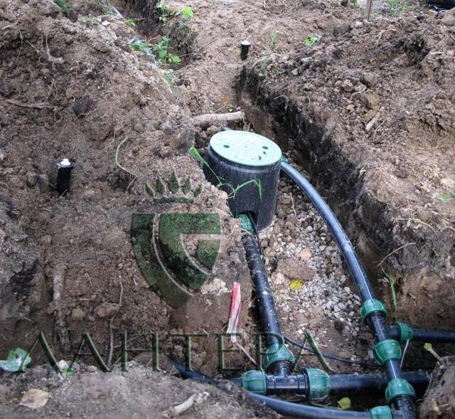 Редко применяют вертикальный дренаж в виде глубоких скважин с проницаемыми стенками. Ключевой элемент в технологической схеме дренажа – труба из поливинилхлорида в обмотке из геотекстиля. Самый главный залог долговечности дренажной системы – соблюдение уклонов и трамбовка слоя щебня, находящегося под трубой. Ливневая канализация (системы поверхностного водоотвода). Категорически запрещается объединять дренаж и ливневую канализацию в одну трубу, также нельзя дождевую воду сливать в кольцевой дренаж вокруг фундамента дома. У этих систем диаметрально противоположные задачи, и разные технологии устройства. Каким способом увести объем воды с крыши и водостоков – это задача решается на этапе ландшафтного проектирования. Для этого разрабатывается чертеж вертикальной планировки, в котором просчитываются все уклоны по отмосткам, дорожкам, площадкам и газонам. Инженер проектирует либо точечные дождеприемники для сбора воды, либо линейные каналы. Устройство системы автоматического полива Cистема автоматического полива является незаменимым помощником в уходе за садом. Дождеватели с разным диаметром полива обеспечивают полное покрытие участка. Спринклеры монтируются вровень с поверхностью грунта, и при пуске системы под давлением выдвигаются на высоту от 7 до 20 см. Для полива деревьев лучше использовать гидранты (водяные розетки). Трубы из ПНД монтируются на глубину 40 см. Система состоит из следующих узлов – пульт управления (контроллер), емкость для аккумуляции воды, магистральный канал, линий дождевания, клапанных колодцев и электрического провода. |