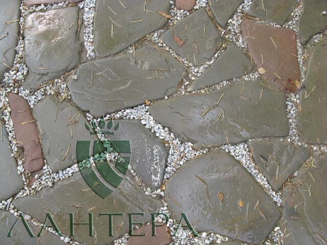 В ландшафтных работах чаще всего применяют песчаник, как самый распространенный и дешевый вариант. Брекчия – мощение из плоского природного камня рваных неправильных очертаний. Толщину 1,5-2,5 см используют при укладке на бетонное основание. При укладке на песчано-гравийное основание применяют толщину 4-6 см. Чтобы придать камню более благородный вид, его обрабатывают в галтовочных машинах, края камня становятся окатанными. Интересный момент – швы между камнем. Существует несколько вариаций – раствор, гравий мелкой фракции и трава.